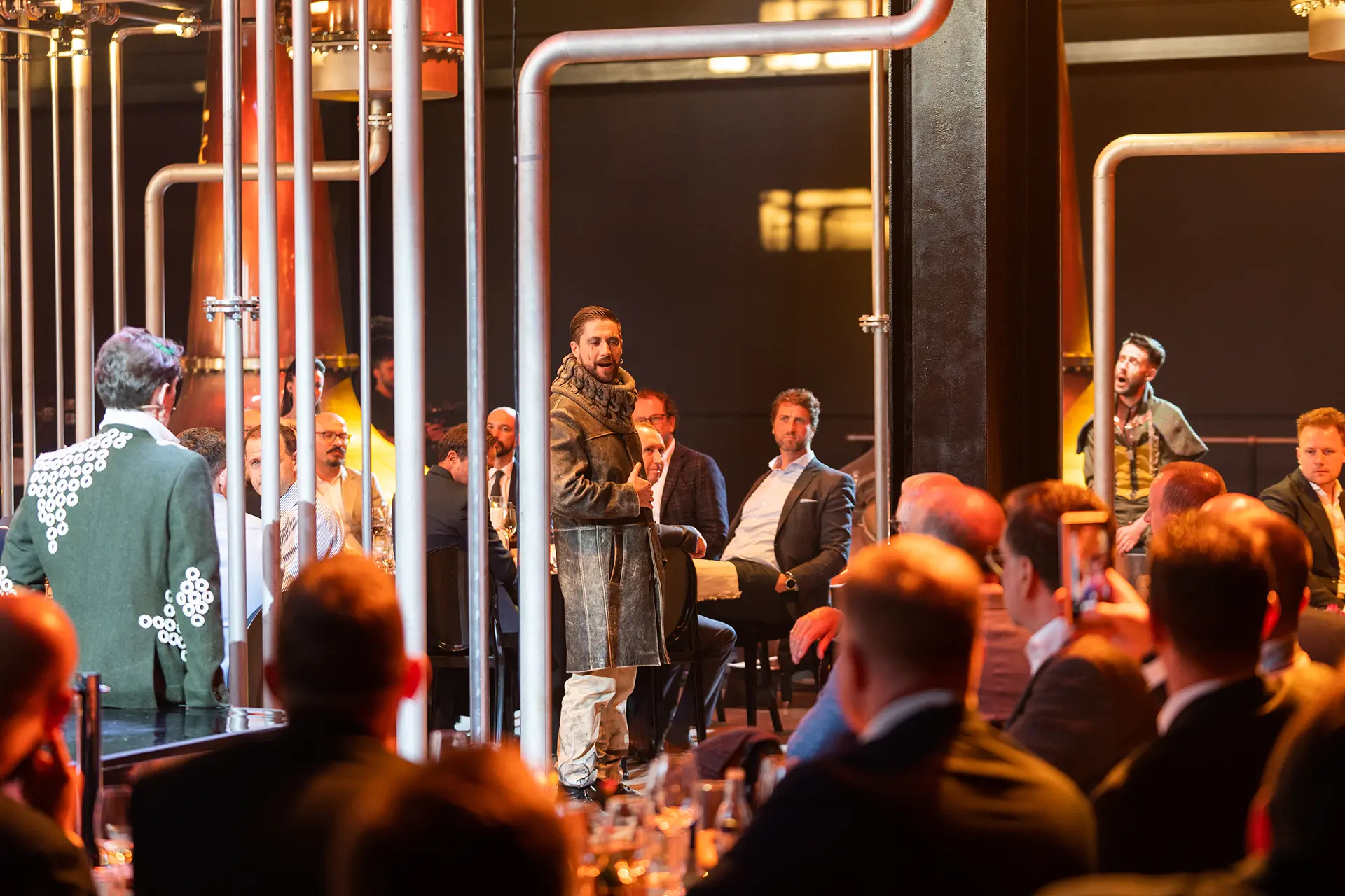 Taking the overall theme of ‘Restless Progress’ and utilising a new manifesto that had been written by the client, we turned this text into a performative piece using a central character to deliver this supported by a piece of new musical composition and supported by our cast and ‘community’ of singers who represented the wider people of the Causeway region. Bushmills itself is a company who have incredibly strong links with the families who have worked with them across the decades. With numerous generations passing through the workplace, we wanted to make reference to this and welcome the guests in to become a part of this new space.