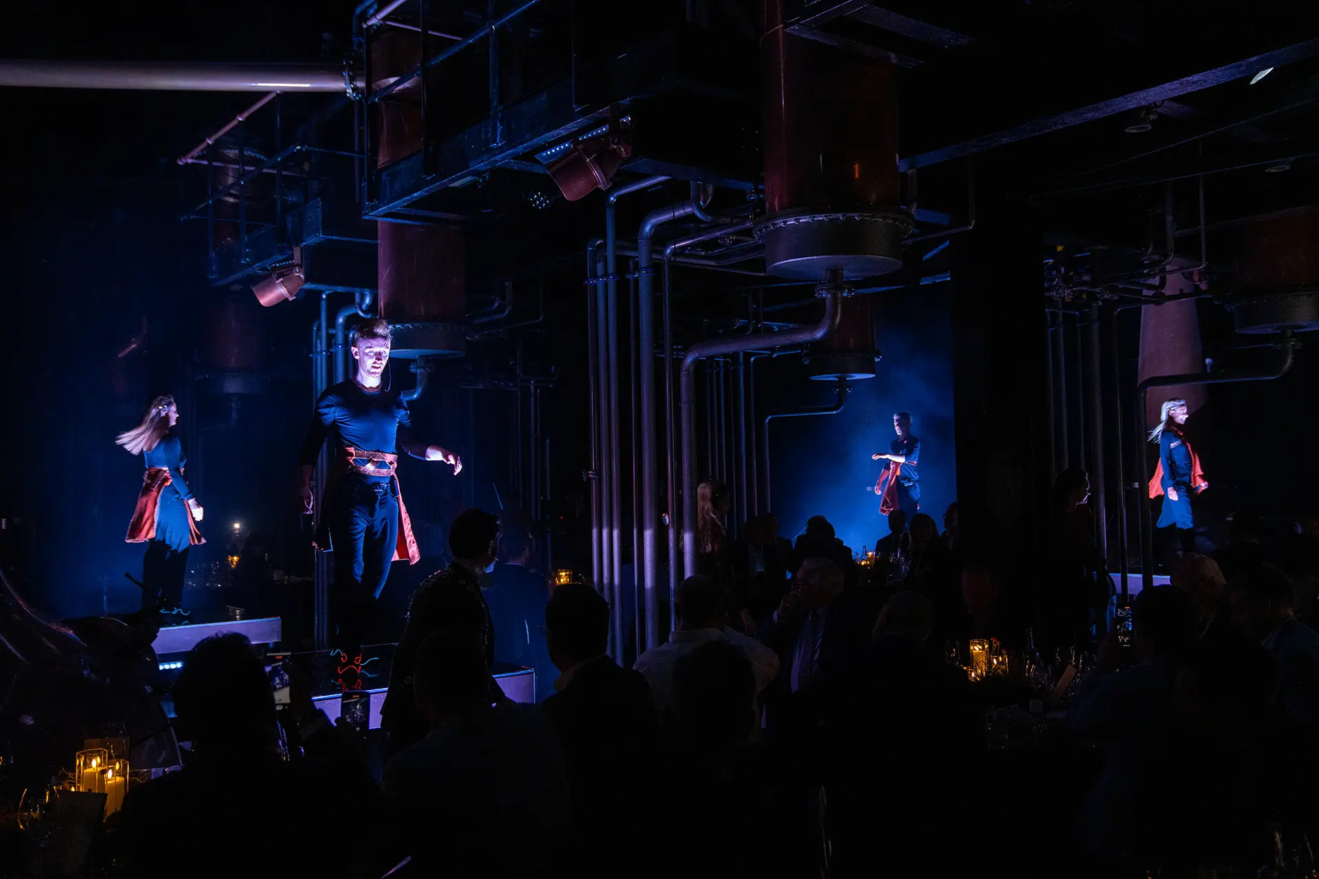 What we discovered through numerous site visits was that despite the space being vast, the layout of the room was actually very intimate and we played on this to create performances that felt immersive with a strong connection to the guests around them. Performers appeared from behind every still and from every available stairwell and entrance point available to create this wraparound feeling.